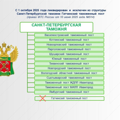 С 1 октября 2025 года Гатчинский таможенный пост будет ликвидирован и исключён из структуры Санкт-Петербургской таможни (приказ ФТС №514 от 10 июня 2025 года). Его код 10210020 аннулируется.